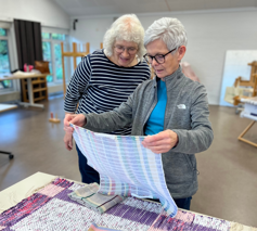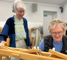 I folkehuset på Voldbækvej i Brabrand har vi et vævehold med syv kvinder, der mødes hver mandag. Nogle har været med, siden jeg startede i 1990’erne, og andre er kommet til for et par år siden, da de gik på pension. Alle kan være med, uanset niveau. Der bliver lavet alt fra tæpper og pudebetræk til viskestykker, duge, halstørklæder og håndklæder. Jeg hjælper og vejleder, og når noget bliver færdigt, lægger vi det op på bordet og beundrer det sammen. Jeg har en lille bog, hvor jeg noterer de ting, der bliver lavet, så vi kan se tilbage på de mange projekter.