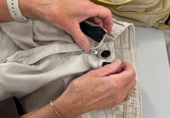 Folk falder tit i snak, og når vi reparerer, får vi også nogle gode snakke. Faktisk bliver det tit et samarbejde. En dag kom en kvinde med en skjorte, hvor kraven var slidt, og en anden kvinde sagde: ”Den skal bare vendes.” Hun vidste, at det gjorde man i gamle dage, og hun forklarede os, hvordan den gamle underside skulle vendes opad, så den så helt frisk ud igen.