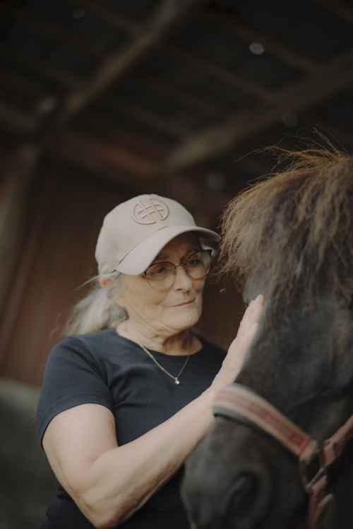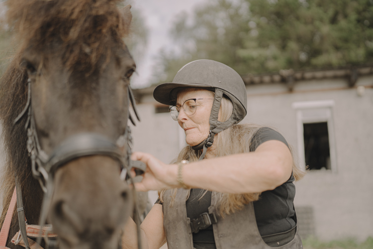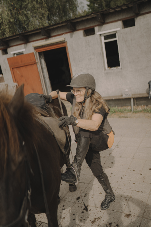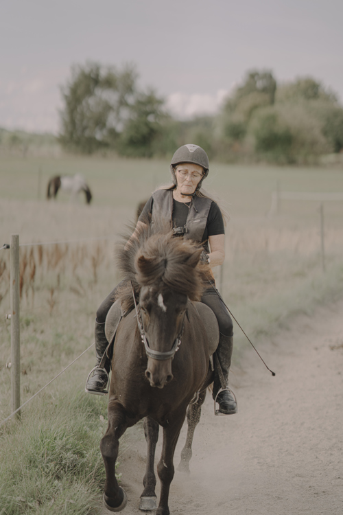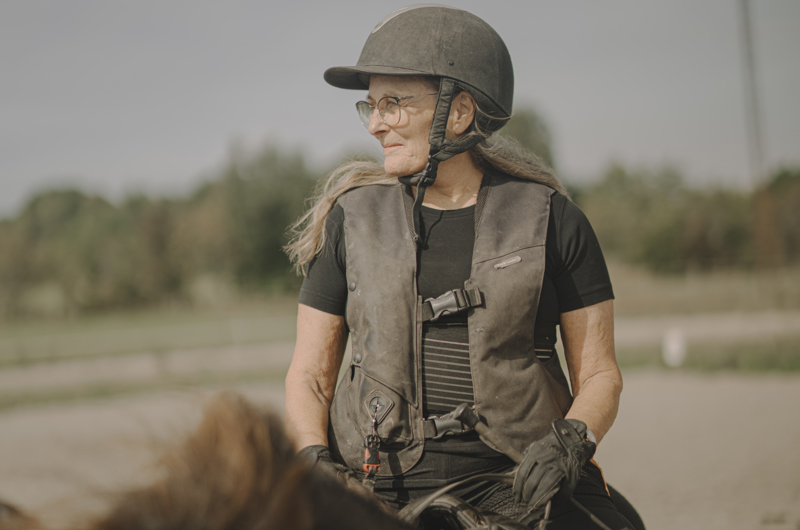 “Når jeg rider, har jeg meget beskyttelsesudstyr på, og jeg ved, hvor mine grænser går. Med heste kan der altid ske noget uventet, og en ulykke kan forekomme, men jeg føler mig tryg med de forholdsregler, jeg tager og den erfaring og viden, jeg har som rytter. Heste har altid været en del af mit liv og giver mig selvfølgelig træning fysisk, men er også med til at holde mig i gang mentalt. Det, at jeg fortsat uddanner mig med ridekurser i både teori og praksis er med til at holde mig skarp, og giver mig samtidig følelsen af, at jeg har noget at give videre.”