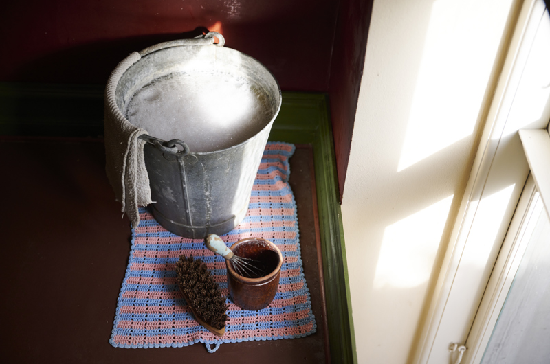 Vi forlader lejligheden. Trappeopgangen knager lidt, da vi går ned. Der dufter tydeligt af noget, jeg ikke kan definere. Det er autentisk brun sæbe, som trappen bliver rengjort i, forklarer Anne Marie. Min 1977’er-fødte næse er klart mere vant til at genkende duften af Ajax, når det kommer til rengøring.