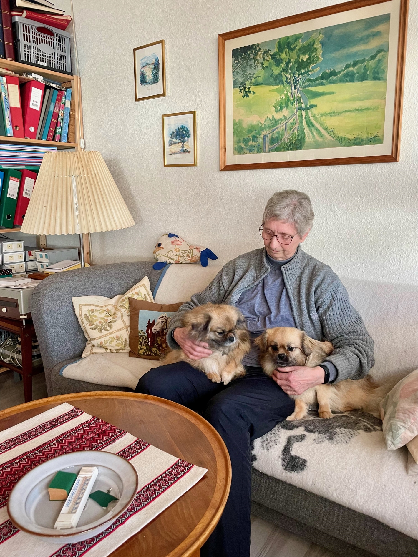 Selvom Dorte savner naturen, er der meget andet, der fylder i hendes nye hverdag. Hun svømmer, laver frivilligt arbejde, passer børnebørn og er besøgsven på det lokale plejehjem med de to hunde.
