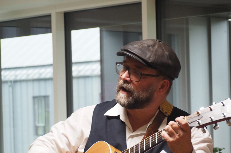 Med guitaren under armen og en kuffert fyldt med sanghæfter går Thorkil Bisgaard mod plejehjemmets fællesstue. På aktivitetskalenderen er der ud for tirsdag formiddag noteret ’Sangcafé’, som en fast ugentlig begivenhed.